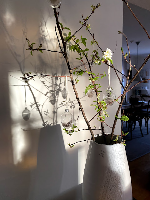 Konstaterade också att den sista magnolian i hörnet också var på gång att slå ut. Den mörkrosa Susan. Men då började det också singla ner vita flingor igen.....
