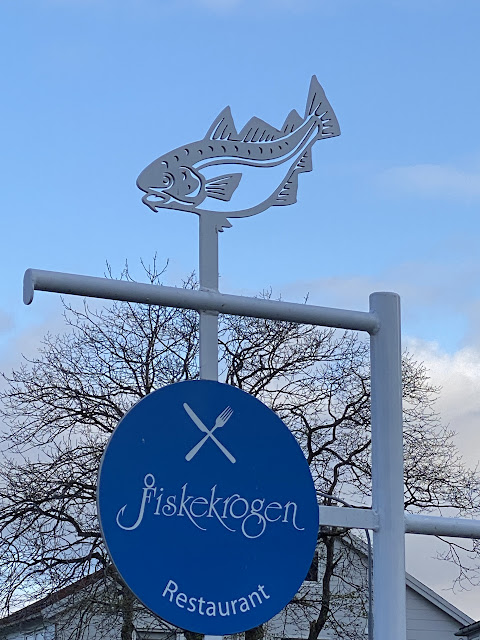 Vi stannade till på Sakrisøya igen för lunch på en fiskerestaurang vi sett på morgonen. Den godaste fisksoppa vi ätit fick vi där och de hade roliga lampor av torkade fiskar.