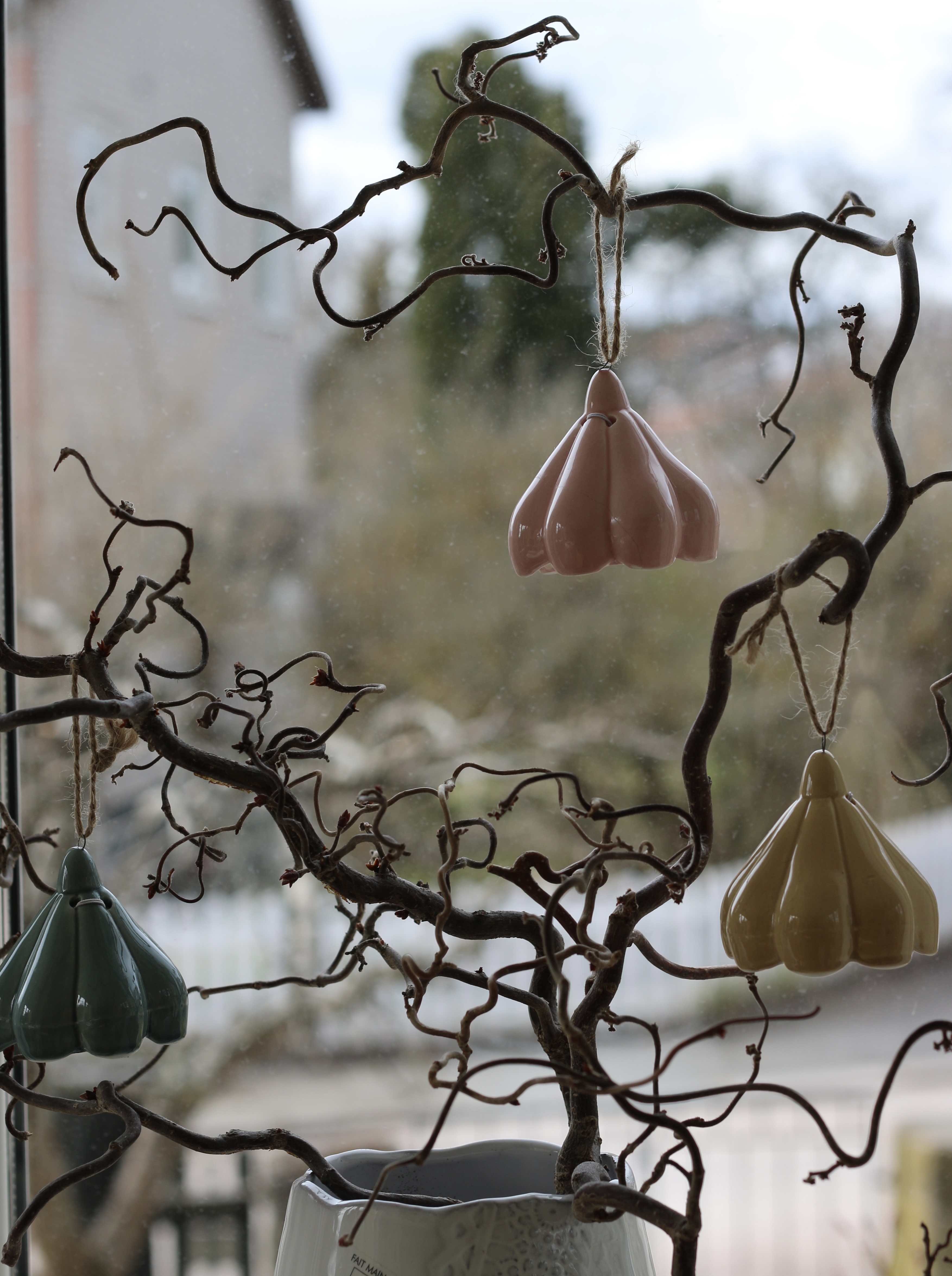 Köpte med mig några söta porslinsklockor som får sitta i hasselkvisten efter påskäggen.